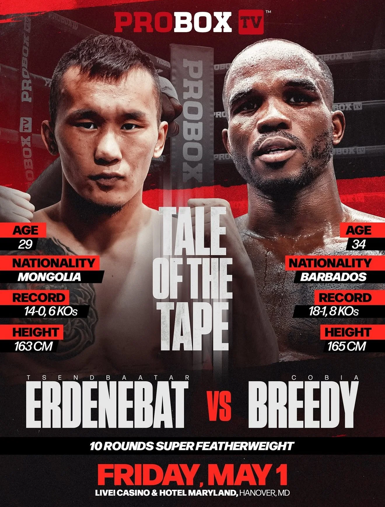 Barbadian native Cobia “Soldier” Breedy returns to the ring on May 1, 2026, when he faces undefeated Olympian Tsendbaatar Erdenebat in a scheduled 10-round main event for the WBC USA Silver Super Featherweight Title. The highly anticipated showdown will headline at The Hall at Live! Casino and will be streamed live on ProBox TV in association with NoXcuse Promotions.